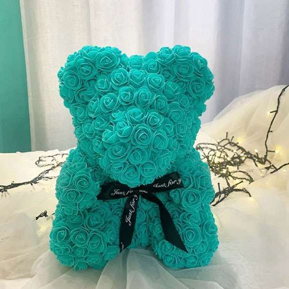 Deze blauwgroene rozenknuffelbeer van 25 cm is een stijlvol en romantisch kunstrozencadeau voor bijzondere momenten. De teddybeer is handgemaakt en bestaat uit hoogwaardige blauwgroene kunstrozen die hun vorm behouden zonder onderhoud.