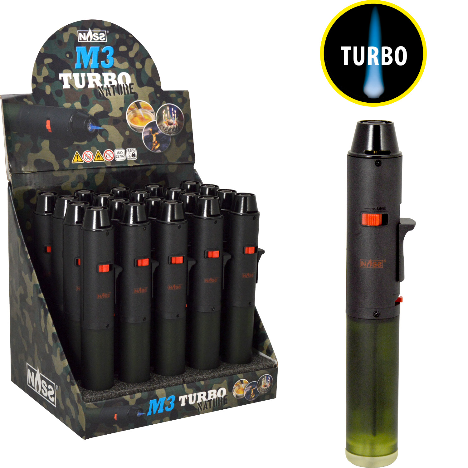 Jet Storm M3 Turbo Nature aansteker display van 20 stuks natuurlijke uitstraling. Jet storm turbo display met krachtige vlam. Turbo aansteker bulk perfect voor retailers.