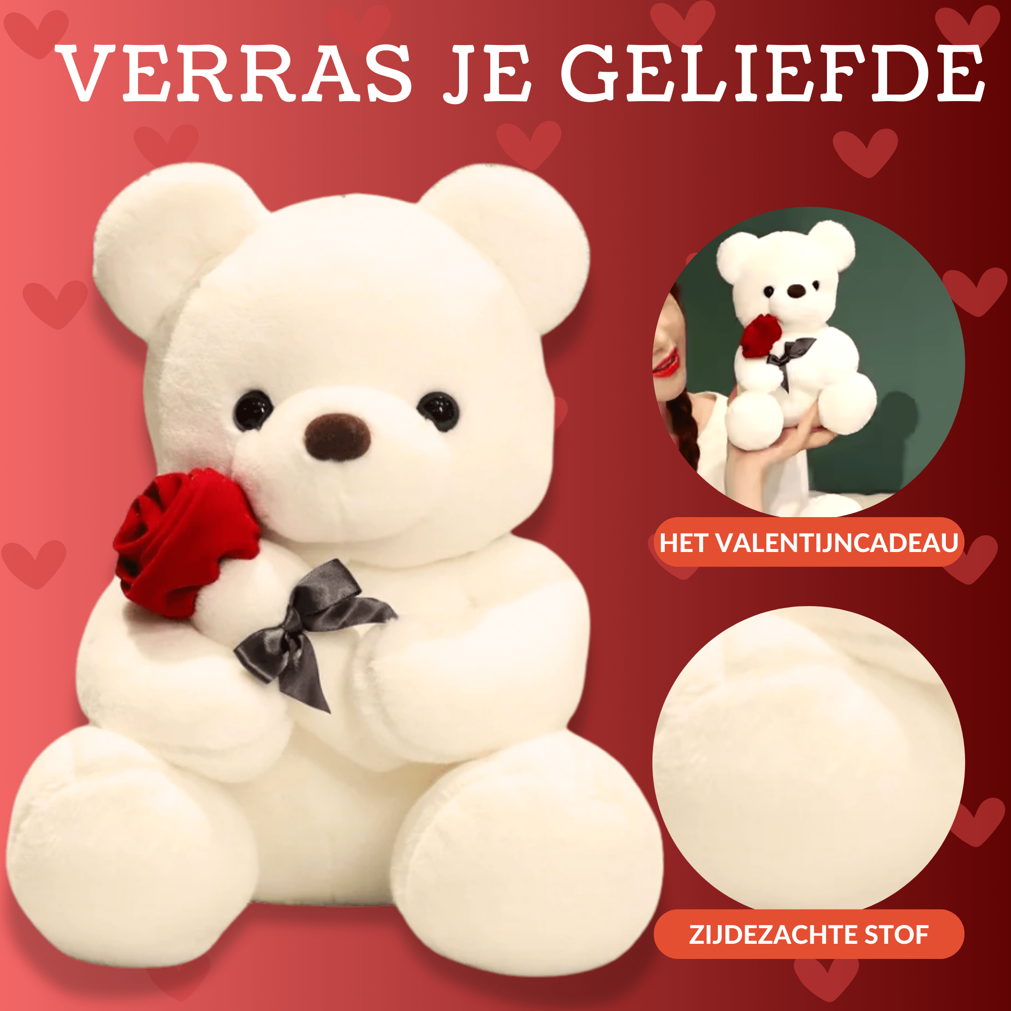 Maak kennis met onze zachte, pluche witte teddybeer, die speciaal is ontworpen om een glimlach op het gezicht van jouw geliefde te toveren! Deze teddybeer houdt een prachtige rode roos vast en is perfect om cadeau te geven voor romantische gelegenheden, zoals Valentijnsdag, een verjaardag, of gewoon om iemand te verrassen. Met zijn grote zwarte ogen, lieve uitstraling, en elegante strik is hij een ideaal cadeau voor zowel kinderen als volwassenen.