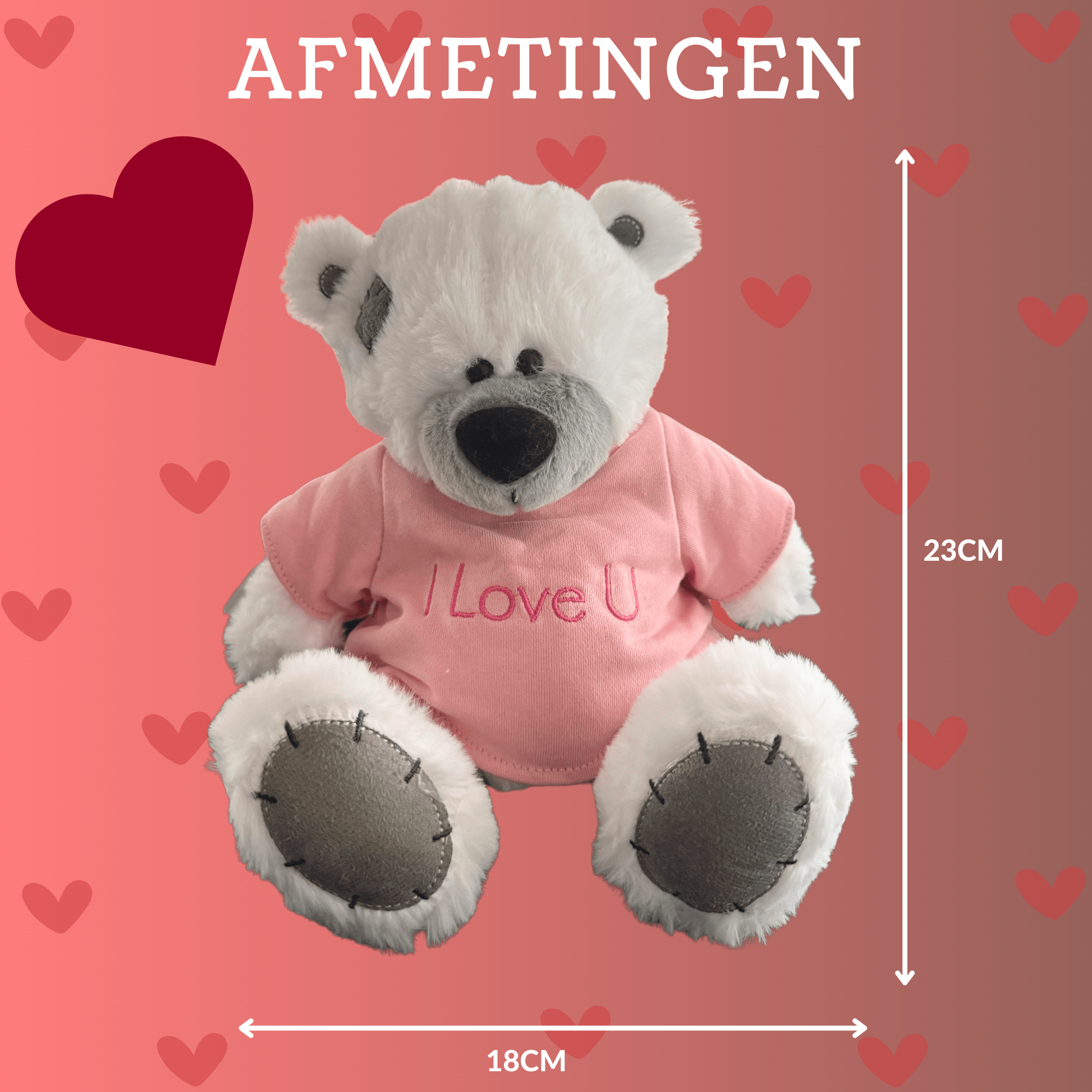 De schattige witte teddybeer met de tekst “I Love U” is een perfecte manier om je liefde te tonen. Met een hoogte van 23-25 cm heeft deze teddybeer een schattige uitstraling en een zachte pluche afwerking. De “I Love U” tekst benadrukt de gevoelens van liefde en genegenheid die je voor iemand hebt.